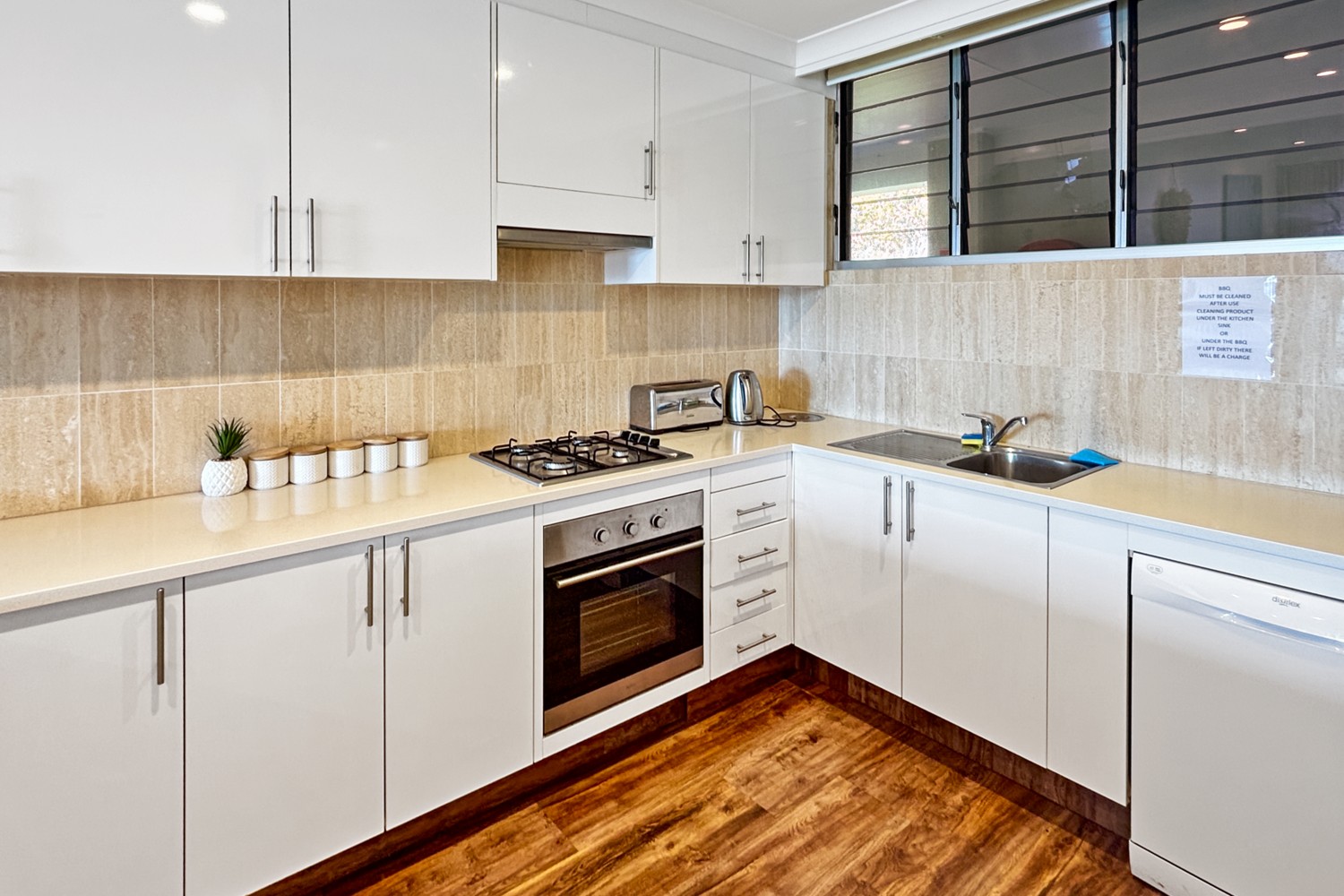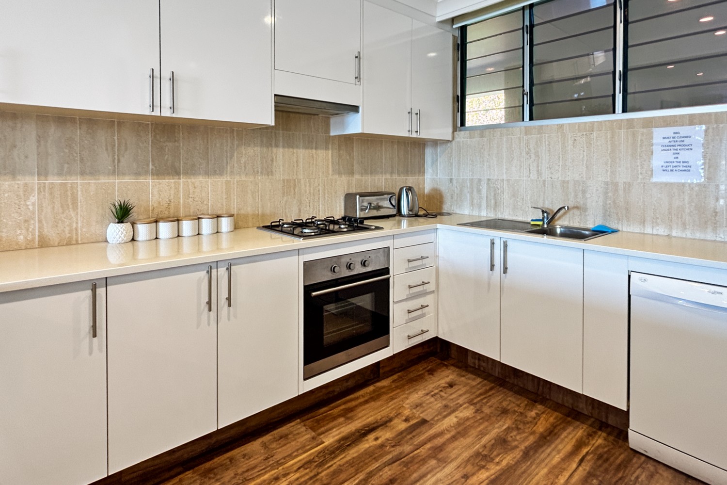 - Modern self-contained kitchen with gas cooktop, dishwasher, microwave, and oven.