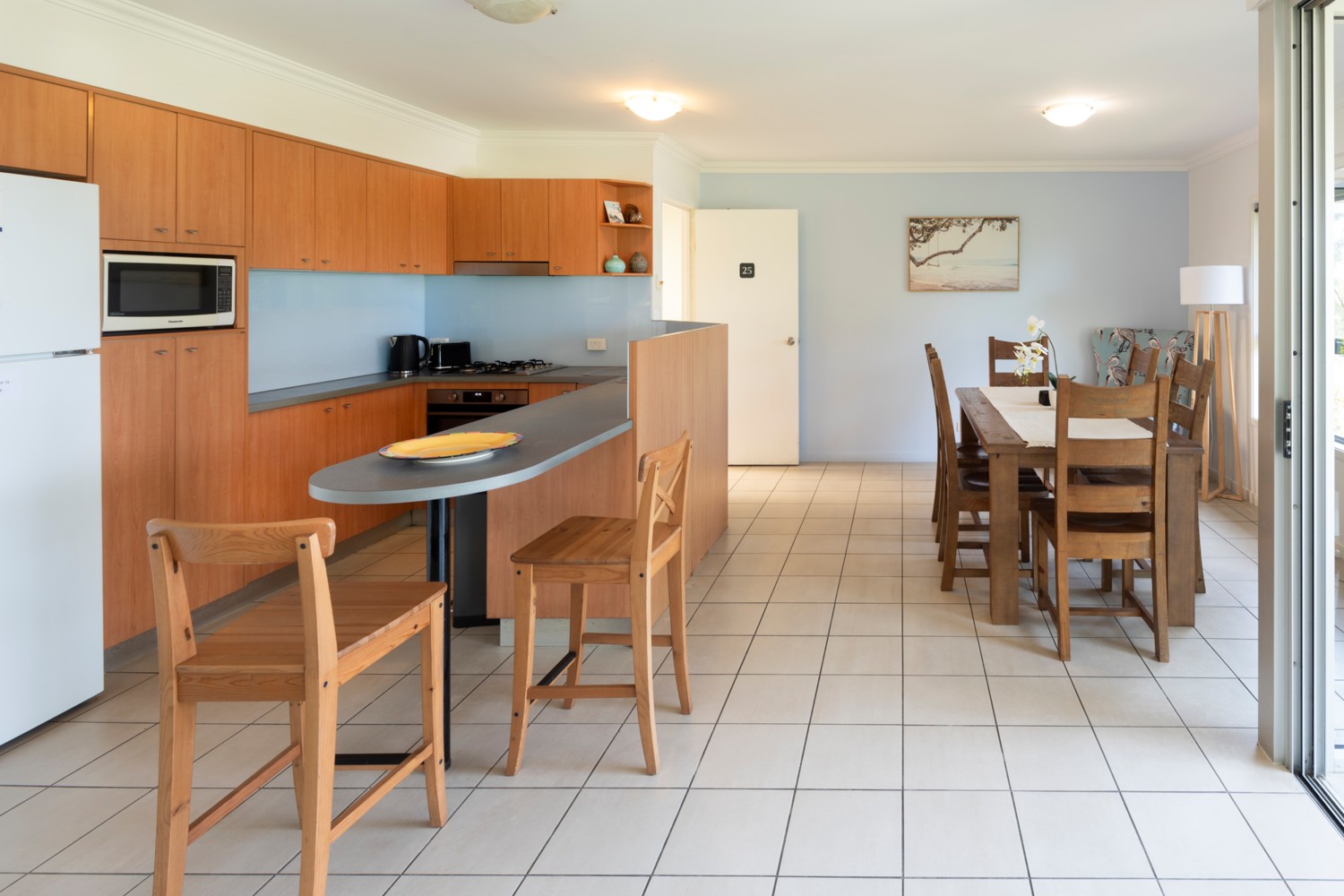 - Self-contained facilities include a well-equipped kitchen with cooktop, oven and microwave as well as a laundry with washing machine and dryer