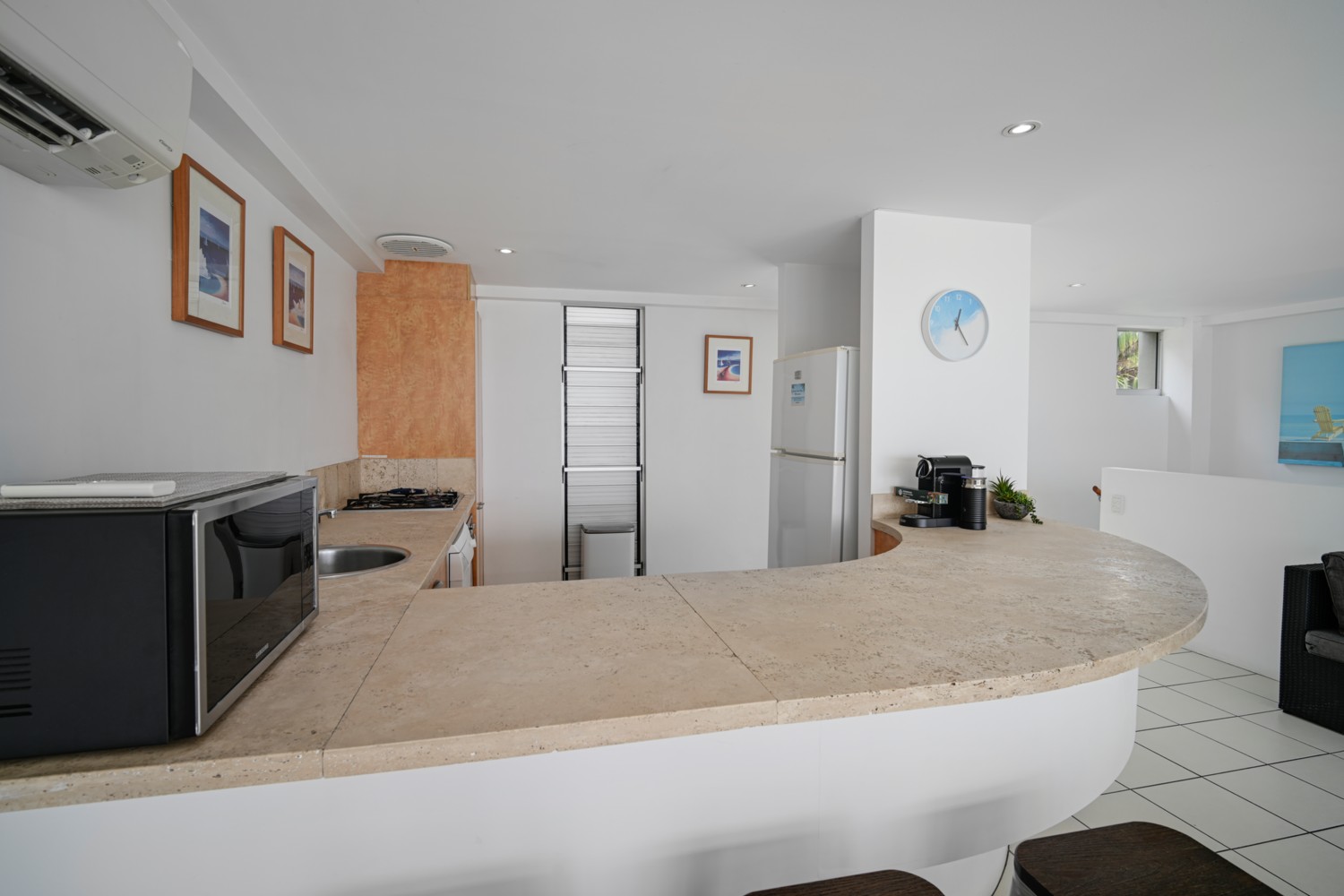 - Fully self-contained including a full kitchen with gas cooktop, dishwasher, microwave, oven and Nespresso Pod machine.